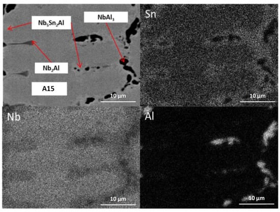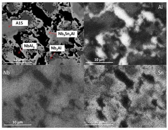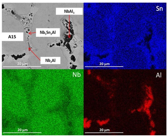 The alloy was given three separate heat treatments: 100 h at 900 °C, 200 h at 900 °C and 100 h at 1200 °C. After 100 h at 900 °C (IP6-HT-900 °C/100 h), A15, Nb2Al and NbAl3 were still present along with newly formed Nb5Sn2Al (Figure 7 and Figure 8c,d), with its composition being close to stoichiometry (Table 4). The bright areas in the X-Ray element map of Sn in Figure 9 suggest the area where the ternary compound is present. NbSn2 was no longer observed. A15 was again the matrix phase, while the other phases were present at the phase boundaries (Figure 8c,d).