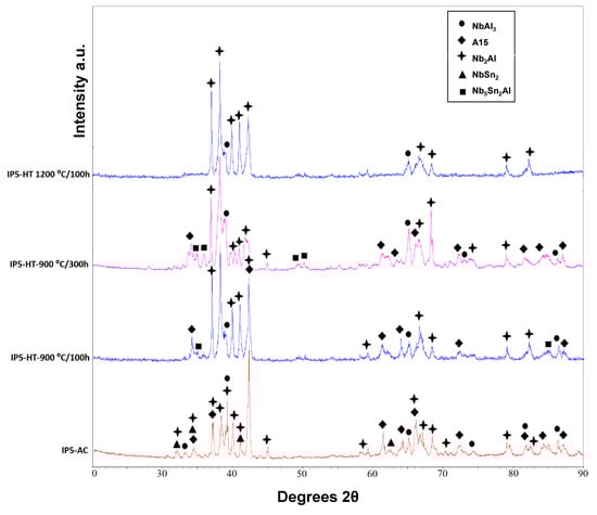 The IP5-AC alloy was heat treated at 1200 °C for 100 h. Two phases were identified by XRD and SEM/EDS: NbAl3 and Nb2Al (Figure 4 and Figure 5g,h). Neither NbSn2 nor the ternary phase, Nb5Sn2Al, was observed. Areas of Sn-rich Nb2Al were evident throughout the alloy, with a larger volume fraction than the Nb2Al with a lower Sn content (Figure 5g,h). Compared with the as-cast sample, the NbAl3 intermetallic had approximately the same composition, while Nb2Al was poorer in Sn by nearly 3 at.% (Table 3). The Sn content in the Sn-rich Nb2Al phase decreased compared with the corresponding phase in the 900 °C heat-treated alloy.