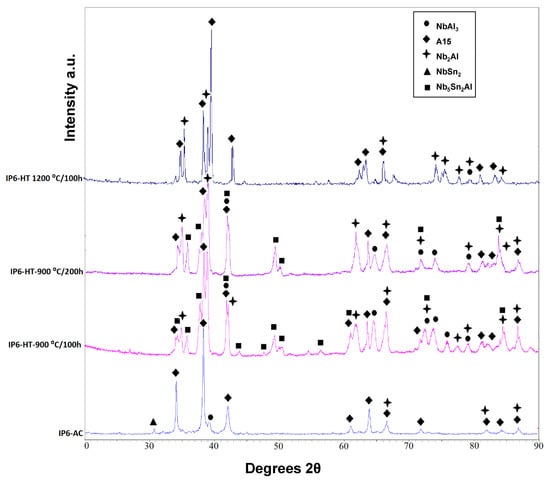 The actual compositions in at.% of the three Nb-based alloys studied in the current work were Nb-17Al-17Sn (IP4), Nb-33Al-13Sn (IP5) and Nb-16Al-20Sn (IP6). These alloys were studied in as-cast states (AC) and after heat treatments (HT) at 900 °C and 1200 °C. The actual composition was measured using SEM/EDS large area analysis discussed below.
