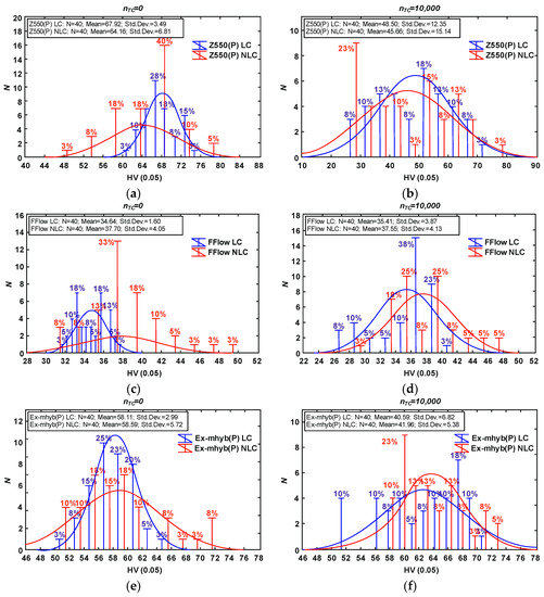 The results of microhardness tests were compiled on the cardinal histograms (Figure 2). The charts include cardinality, percentage share, and descriptive statistics. The Shapiro–Wilk test of normality (α level of 0.05) was performed (Table 1). The microhardness of the studied composites is varied among materials. The type of composite has an effect on hardness range. Some studies indicate that filler content influences hardness [45,46]. The microhardness of flow composites was lower than for microhybrid materials. Despite the similar content of filler particles in Ex-mhyb(P) and Z550 composites, these materials differed in their hardness. The similar results were obtained by Yeh et al. [47]. In the paper [47], it was found that the proportion of filler particles affects the hardness, however, the effect of the particle size and size of the disperse phase is greater. According to [48], the use of nanoparticles as a part of the filler increases the hardness of the material. According to [49], hardness depends on the size, dispersion, and content of filler particles in the matrix and the adhesion of filler and matrix particles. The degree of cross-linking and conversion can also have a positive effect on microhardness as well as the content of zirconium particles in the Z550 structure. The research presented in [50,51] showed that as the content of zirconium particles in the material increases, the hardness of the composite increases. The hardness of zirconium particles is 17 GPa, while another popular filler, also used in experimental materials, is about 3–4 GPa [45].