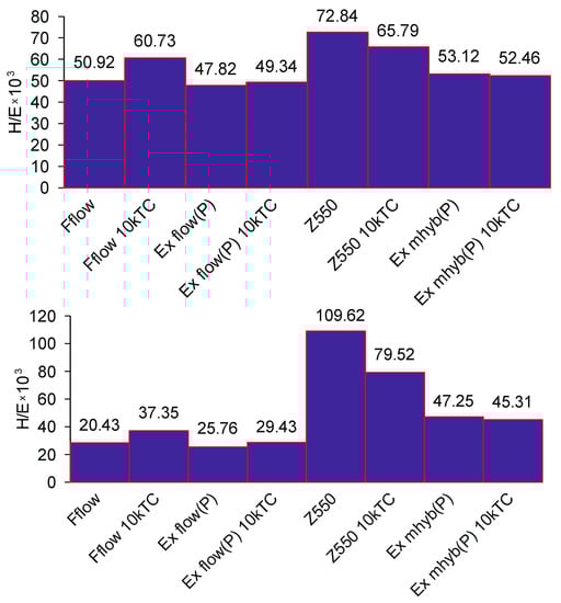 In some works, researchers use the ratio H/E [54] (indention hardness HIT to the elastic modulus of the surface E based on [38,39,40]) obtained by the Oliver–Pharr method [16]. This coefficient combines the ability to make as much elastic deformation as possible (low modulus) and the ability to minimize permanent deformation (high hardness). For many materials, yield strength σY (yield stress) is related to the hardness H (typical H ≈ 3σY). The H/E ratio expresses ‘elastic strain to failure’ and elastic resilience of material. The higher the H/E and H2/E ratio, the greater the wear resistance should be in the material [55,56].