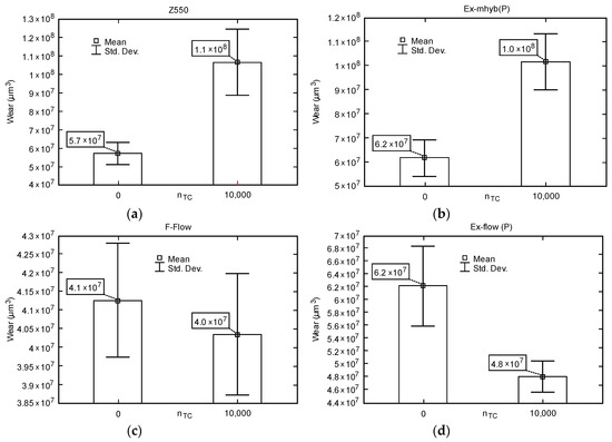 Box-whiskers graphs of wear depending on the number of fatigue cycles TC: (a) Z550; (b) Ex-mhyb (P); (c) FFlow; (d) Ex flow(P).