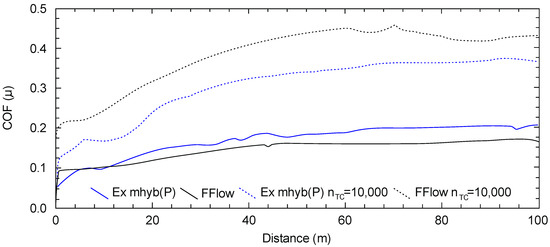 Table 3 presents the values of friction coefficients. The minimum, maximum, average, and standard deviation of the coefficients of friction are presented. In Figure 6, selected courses of friction coefficients as a function of the friction distance of dental materials are presented. It seems that hydro-thermal non-violent defects overlap with tribological ones, which is manifested by the increased wear of Z550 and Ex-mhyb(P). The phenomenon related to the damage from the hydro-thermal factor is also confirmed by the friction coefficient μ as a function of the friction path. The values of the coefficient of friction in the case of Z550, Ex-mhyb(P), FFlow composites increase significantly after thermocycling, which is probably caused by the damage of the surface (Table 3 and Figure 6). However, in the case of a flow-type material, this does not translate into deterioration in wear resistance (Figure 5), which is crucial for durability. In the case of Ex-flow(P) material, thermo-cycling results in a decrease in the coefficient of friction. The phenomenon of increase and decrease in the coefficient of friction of dental composites under the influence of thermocycling was also noted in [30].
