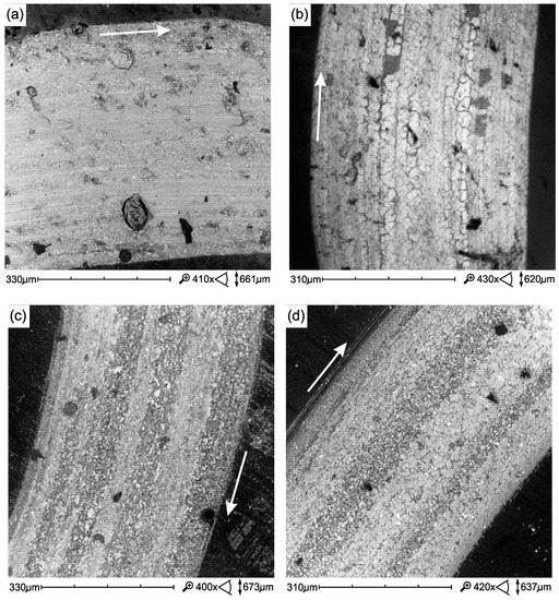 Figure 8 summarizes the wear trace of the tested composites. Microscars are visible in the images in the trace of wear, consistent with the direction of motion in the kinematic pair, caused by microsurging. Surface defects visible in Figure 8a,b of composites with high filler content are also associated with pitting (a) and spalling (b). In flow-type composites, such damage occurs less frequently (Figure 8c,d).