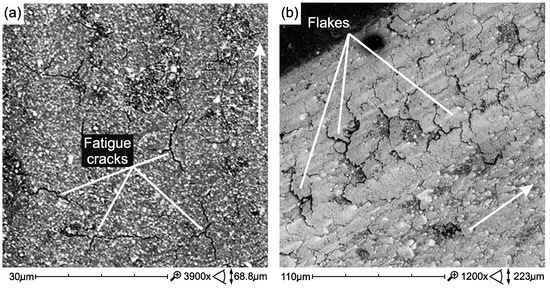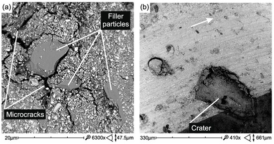Figure 10 presents damage developing in the environment of inclusions and/or large filler particles. Microcracks initiate in the vicinity of the filler particles (Figure 10a), they develop as a result of cyclic loads, leading to the weakening of the cohesion of the filler particles and lead to chipping (pitting). In Figure 10b, the craters formed after the removal of a large filler particle are visible. Removal of the particle, which was weakly bound due to the development of fatigue cracks, was caused by tacking micro-lines on surfaces cooperating with friction. It is probably an adhesive mechanism of destruction [32].