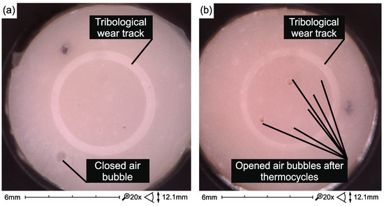 Surface of Ex-flow(P) composite samples without (a) and after thermocycling (b) and testing on a tribometer.