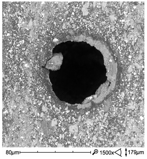Opened air bubble in Ex-flow(P) composite structure exposed as a result of the combined effect of degradation factors—thermocycling and tribological wear.