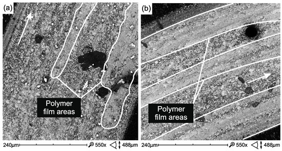 Surface of friction of Ex-flow(P) composite samples without (a) and after thermocycling (b). Direction of sliding marked by an arrow.