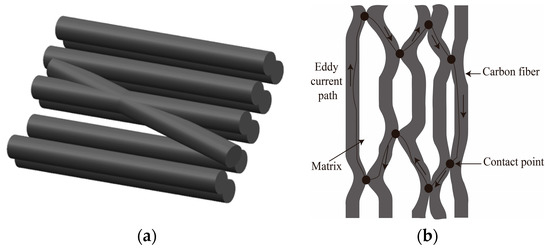 The schematic diagram of conductivity of carbon fiber reinforced plastic (CFRP): (a) Contact points between carbon fibers; (b) Current path between carbon fibers.