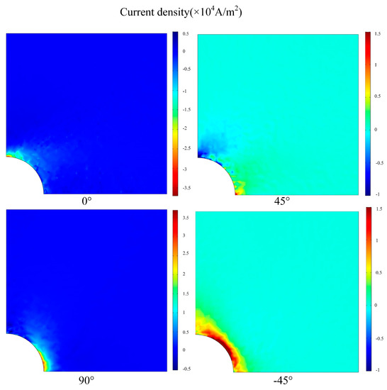 The EC distributions on the first four plies [0/45/90/−45] from the top of CFRP composite laminates with and without a crack is shown in Figure 11 and Figure 12, respectively. Under the simulation condition, the distribution of the EC for each ply is not the same because of the effect of the fiber orientation. For the plies with fiber direction of 0° and 90°, the distribution of EC is concentrated in the position of the opposite sides of the hole edge. The EC flows in the opposite direction when located on the ply with fiber orientation in 45°. The EC repartition of ply with fiber direction of −45° is mainly concentrated at the central area of the hole edge. When the artificial crack set at the central area of the hole edge, the EC distribution of ply with fiber direction of −45° changed dramatically due to the current density decreasing. This indicates that the effect of magnetic field generated by EC becomes lower leading the induced voltage of the sensing coil to increase.
