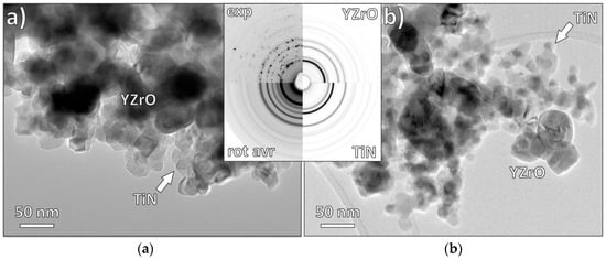 TEM micrographs of (a) TiN-coated Y-TZP powder particles (15ISS) and (b) admixing of commercial TiN nanopowder with Y-TZP (15MCP). In both cases, the SAEDP (inset; exp = experimental pattern, rot avr = rotational average of experimental pattern, YZrO, and TiN are calculated simulations) corresponds to a mixture of pure tetragonal YZrO and cubic TiN, without intermediates.