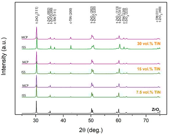 In Figure 2, the XRD patterns of SP-sintered composites differing in TiN content prepared by ISS and MCP are shown. For comparison, pure Y-TZP SP-sintered under the same conditions is also presented. In all the composites, the 3 mol% yttria-doped tetragonal ZrO2 and the cubic TiN (osbornite) phase were the only crystalline phases present. No monoclinic ZrO2 nor titania residues were observed, which, in the case of ISS composite powder, indicated the complete nitriding process for the precipitated titania NPs, leading to TiN [25]. As expected, the peak intensity of the TiN increased with the increasing content of TiN, regardless of the fabrication route used for the composite powders.
