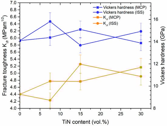 Indentation toughness and Vickers hardness as a function of the TiN content of the SP-sintered (1300 °C, 5 min, 50 MPa) composites fabricated by the ISS and MCP routes.