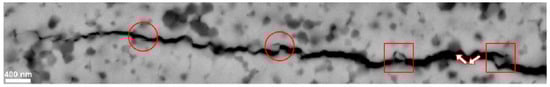 SEM micrograph showing an arrested crack propagated from the Vickers indent. Circles, squares, and arrows indicate the crack branching, crack bridging, and crack deflection, respectively.