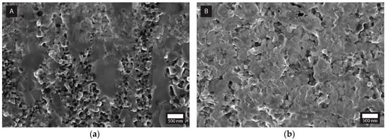 In accordance with the literature [5], composites that attained a conductivity of at least 0.01 S∙cm−1 could be machined with EDM. Nevertheless, the surface quality of the machined composites varies a great deal with the EC and machining parameters [26]. The results of the investigated machined composites in terms of the material–removal rates and surface roughness are presented in Table 2, while the microstructures of the EDM-machined surfaces are represented in Figure 8. The surface roughness of the machined composites are comparable with those machined with standard EDM parameters (8 A, duty factor 11%, pulse duration 1.6 µs). The achieved surface finishes in the range 2–4 µm and the rather modest material–removal rate was acceptable in terms of the mild machining parameters. Applying more severe EDM parameters could result in higher volumetric material–removal rates as in the case of Put et al. and Pitman [26,43]. The machinability in terms of the material–removal rate, although modest, was better in the case of the ISS-fabricated composites, given their much more pronounced EC (Table 2).
