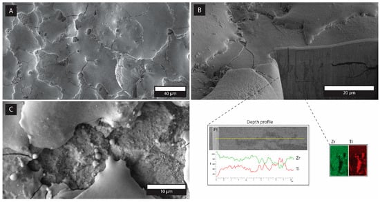 The surface microstructures after the EDM process were, as expected, similar for both fabrication routes, as were the measured roughnesses (Table 2). The typical microstructure of the EDM-machined surface and the subsurface of the 30ISS composite is presented in Figure 8. The edge of the pit was sharp (not shown), while the bottom surface exhibited an orange-peel-like surface finish, interlaced with propagating surface cracks (Figure 8a), which was indicative of the intense melting and re-solidification processes of the material during the subtractive EDM process. In the higher-magnification images (Figure 8c), spherical precipitates and pore channels, where the material was possibly drained out from the bulk, are visible. Nevertheless, the (sub)surface layer was relatively coherent with no delamination or phase segregation. Surface cracks were, however, propagating into the vicinity of the near subsurface, but were oriented parallel to the EDM surface (Figure 8b). In the inset of Figure 8b, the results of the EDS mapping, besides showing a homogeneously dispersed TiN phase (Ti in red) within the ISS sample, also confirmed the presence of the channel-like agglomeration of TiN phase composed of TiN nanoparticles (also observed in the inset of Figure 3e, Figure 4a1,a2 and Figure 7a) being positioned perpendicular to the disk surface. The latter might be the reason for the substantial increase in the electrical conductivity of the ISS samples compared to the MCP samples that contained ≥15 vol% of TiN phase, which was obviously high enough to achieve the EC required for EDM.