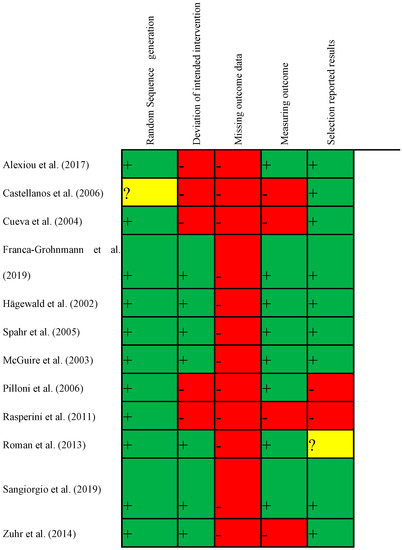 - Higgins, J.; Savović, J.; Page, M.; Sterne, J. A Revised Cochrane Risk of Bias Tool for Randomized Trials; Chandler, J., McKenzie, J., Boutron, I., Welch, V., Eds.; Cochrane Group: London, UK, 2016. [Google Scholar]