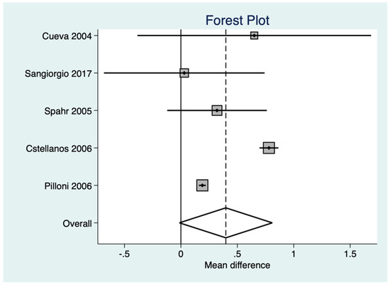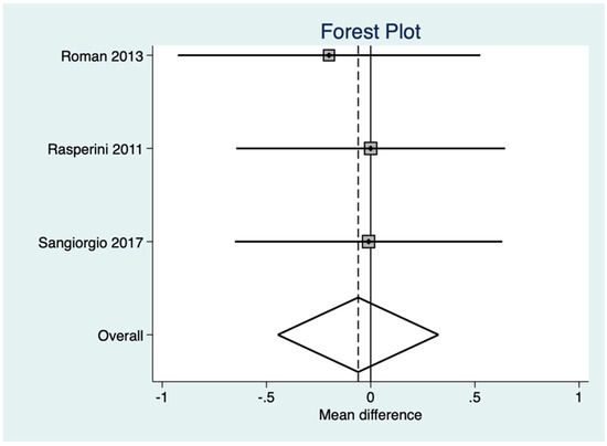 The mean difference between the two groups resulted in −0.06 mm (95% Conf. Interval Lower Upper −0.45 to 0.33) (p = 0.7603), so the difference was in favor of the control group. This difference was not statistically significant. Publication bias (Egger Method) [27] was not statistically significant (t = −11.18, p < 0.057).