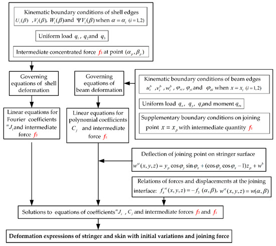 For solving the coefficients in the explicit expressions of stiffener and shell deformation, the proposed intermediate quantities, concentrated forces at the joining interface of the coupled structure as fi in Equation (20) and fy and fz in Equation (34), still should be calculated. Moreover, force fz and f3 in the normal direction of the surface have the main effect on the actual panel profile since the automated drilling and riveting system of aircraft panel can achieve the measurement of surface normal and adjustment of machining direction. In summary, the detailed procedures for deformation calculation of stiffened panel with initial variation and joining force are illustrated in Figure 2.