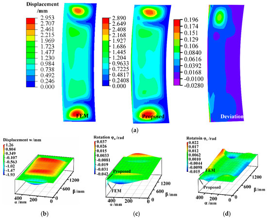 Figure 4 and Figure 5 indicate that shell and beam deformation results provided by the proposed method are consistent with FEM result. As seen in Figure 4a, the shell displacement has increased nearly fourfold from initial variation 0.814 mm to 2.89 mm. Initial variations are obtained by , the variables of which are listed in Table 3. The functional boundary conditions cause the dramatical changes in the displacement. Maximum deviation of shell displacement between FEM and the proposed results are 0.196 mm which can verify the accuracy of the semi-analytical solutions. Figure 4b shows that deflection w in the direction of surface normal increases considerably before a decline when and then decreases finally. Displacements w and rotation φu distribute almost symmetrically with respect to section . It is noted that φu and φv provided by the FEM have distortion near the edge node while the proposed semi-analytical solution has a more stable value, as seen in Figure 4c,d.