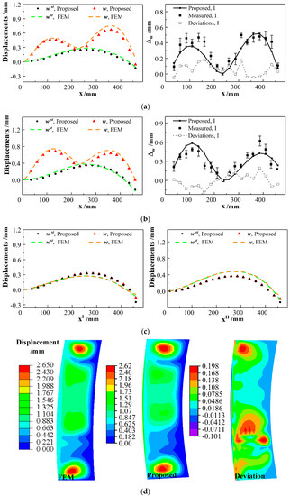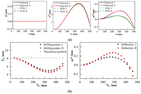 During the positioning and clamping process, the panel components, skin and stringers, are just subjected to the initial kinematic boundary conditions listed in Equations (9) and (36) without the joining force. Substituting boundary conditions in Table 3 and Table 4 into the Fourier series expansion of shell displacement functions and beam deformation expressions, unknown coefficients and can be derived. Deformations of shell, beam I and beam II are provided by the proposed method, as shown in Figure 4 and Figure 5a. FE models of shell and beams are established by using commercial software ABAQUS® 6.14 Standard with S8R element and B33 elements, respectively. Approximate element size is 25 mm and the grid number of FE model is over 1440.