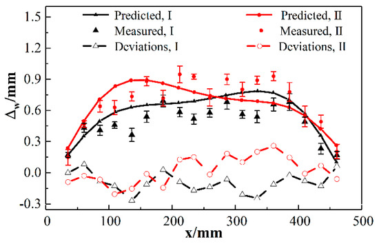 Besides, positions of points to be joined on the stringers I and II are predicted by solving a system of equations and by the Newton–Raphson approach. Substituting the solutions and into Equation (35), deflections wst of the points to be joined are obtained, as shown in Figure 5b. Based on the theoretical arc lengths of skin, , the actual positions of points to be joined on shell are obtained by solving a system of equations and . Solutions are substituted into Equation (A2), deflections w of the points to be joined on skin are calculated. In the practical aircraft assembly process, actual clearance between the panel components is measured to describe the relative deformation variation directly. A comparison of the predicted clearance and measured data is made to analyze the relative deformation components in the directions of surface normal, as shown in Figure 6.