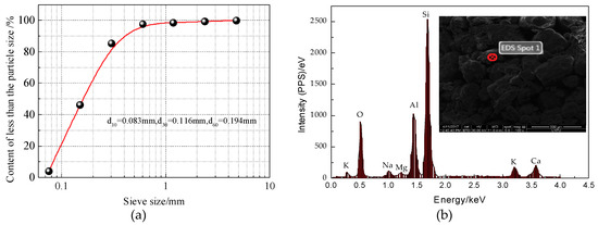 The soil samples were taken from an embankment filled with aeolian sand in the TJ-10 section of the Beijing-Shenyang passenger dedicated company in Fuxin, Liaoning province, China. The basic physical and mechanical parameters of the samples are listed in Table 1, and the chemical composition of aeolian sand samples listed in Table 2. The particle gradation and chemical composition and the chemical element analyzed by EDS (Energy Dispersive X-Ray Spectroscopy) are shown in Figure 1.