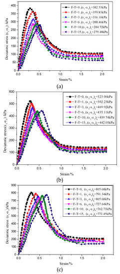 Triaxial shear tests of samples treated with different freeze-thaw cycle numbers. (a) σ3 = 50 kPa; (b) σ3 = 100 kPa; (c) σ3 = 200 kPa.