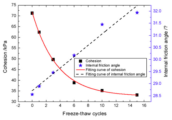 The shear strength parameters correspond to different freeze-thaw cycle numbers and were calculated according to a group of Mohr’s circles with the deviating stresses corresponding to confining pressures of 50, 100, and 200 kPa, respectively. The law of variation of the shear strength parameters with the number of freeze-thaw cycles is shown in Figure 5.