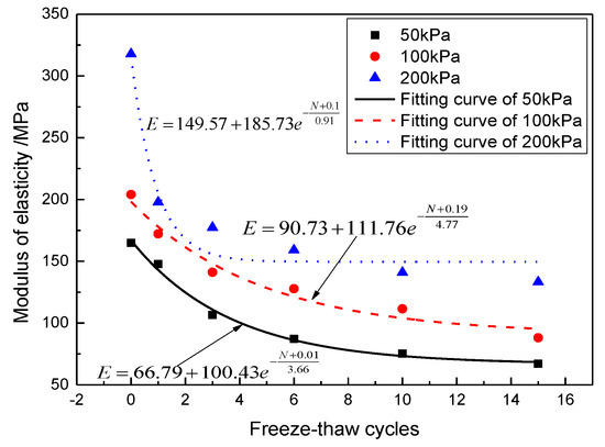 As seen from Figure 4, there was no explicit relationship between peak shear strength and the number of freeze-thaw cycles, although the number of freeze-thaw cycles has a significant effect on the elastic modulus. Therefore, the elastic modulus can be used as an index to measure the effect of freeze-thaw cycle number on the mechanical properties. The strain of 0.25% can be regarded as the end of the linear elastic stage. In the field of damage theory, the "elastic modulus method" is a method based on the assumption of strain equivalence to define the damage variables based on the elastic modulus before and after suffering damage. The attenuation law and fitting equation of the elastic modulus under different confining pressures are shown in Figure 6.