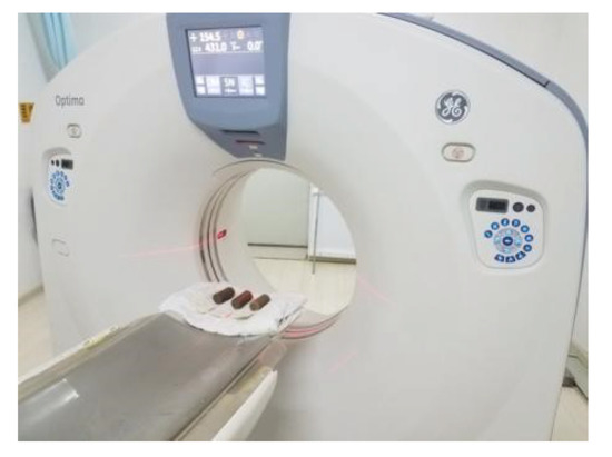 The evolution of aeolian sand after freeze-thaw cycling was observed using a GE Optima 520 CT scanner (produced by GE company, Boston, MA, USA ) (Figure 7). The CT value of the CT scanner ranges from −1024 to 3071 Hu, and each scan be completed within 5–10 s. The spatial distribution law is 0.8, the density contrast resolution is 0.5%, and the minimum scanning layer thickness is 0.625 mm. The gray images obtained from CT scanning after 0, 1, 3, 6, 10, and 15 freeze-thaw cycles are shown in Figure 8, where the black regions represent the pore areas, the white regions represent the particle skeleton, and the gray regions represent the excess area between the pores and particles.
