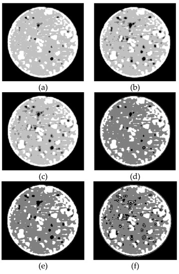Grayscale images obtained by CT scanning. (a) Freeze-thaw = 0; (b) Freeze-thaw = 1; (c) Freeze-thaw = 3; (d) Freeze-thaw = 6; (e) Freeze-thaw = 10; (f) Freeze-thaw = 15.