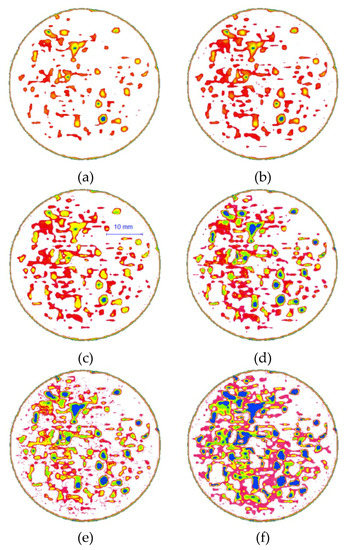 Images processed using the pseudocolor technique. (a) Freeze-thaw = 0; (b) Freeze-thaw = 1; (c) Freeze-thaw = 3; (d) Freeze-thaw = 6; (e) Freeze-thaw = 10; (f) Freeze-thaw = 15.