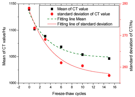 The mean (ME) and standard deviation (SD) of the CT values are two important statistical and quantitative indicators for describing X-ray penetration ability. These values can be used to describe the damage evolution law during freeze-thaw cycling. The laws of variation of ME and SD of the CT values are shown in Figure 10. As seen from Figure 10, both the ME and SD values decrease with increasing freeze-thaw cycle numbers, an observation that is especially significant in the first three freeze-thaw cycles, where the slope changes most rapidly. After three freeze-thaw cycles, the curves tend to stabilize. During the freezing process, the internal water migrates to the outer surface of the sample where it continuously freezes, resulting in the formation of voids within the sample and the expansion of larger cracks. This is why the freeze-thaw damage is most prominent during the initial freeze-thaw process.