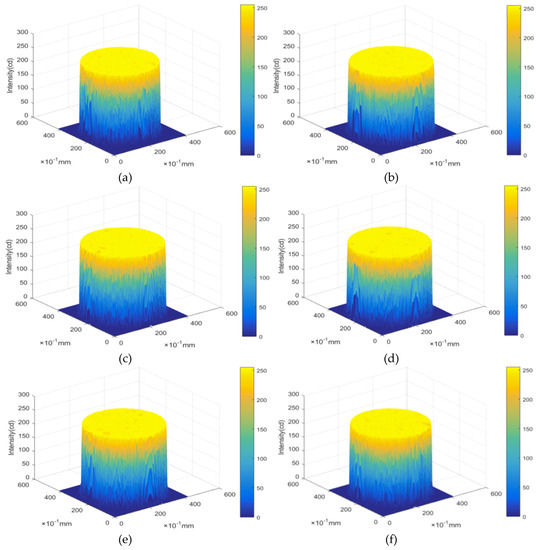Variation of light intensity after freeze-thaw cycling. (a) Freeze-thaw = 0; (b) Freeze-thaw = 1; (c) Freeze-thaw = 3; (d) Freeze-thaw = 6; (e) Freeze-thaw = 10; (f) Freeze-thaw = 15.