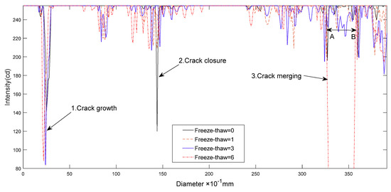 The light intensity distribution law was developed using MATLAB image processing technology after freeze-thaw cycling of the CIAS samples, as shown in Figure 11, and the development trend followed by the cracks is shown in Figure 12.