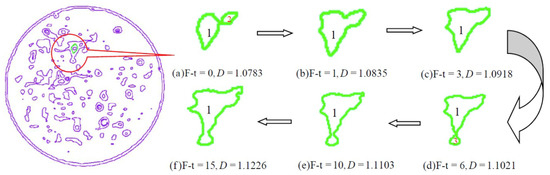 Before freeze-thaw cycling, initial defects are present in the CIAS sample, and trends that pore 1, pore 2, and pore 3 follow as they change over time are shown in Figure 13a–f. As the freeze-thaw cycle number is increased, the area of each pore also increases, the edge of the pore becomes wrinkled and tortuous, and the degree of complexity of the pore edge gradually increases. When the number of freeze-thaw cycles exceeds six, pore 1 and pore 3 make contact and gradually merge into one larger pore. In addition, both the complexity of the pore edge and fractal dimension of the system increase as this cycle number is exceeded.