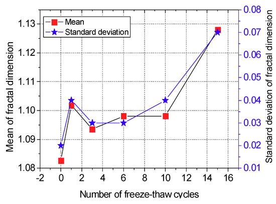 As seen in Figure 14 and Figure 15, the mean of the fractal dimension fluctuates as the number of freeze-thaw cycles is increased. After the first freeze-thaw cycle, both the fractal dimension and the number of pores dramatically increase, indicating that there are more primary pores at this time. As the frost heaving force causes the most serious damage to the original pores, the irregular degree of the pore edge increases.