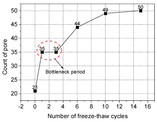 Due to the random distribution of pore size and the pore evolution process observed during freeze-thaw cycling, a statistical theory was adopted to analyze pore evolution. The variation of the average pore area with the number of freeze-thaw cycles is shown in Figure 20.