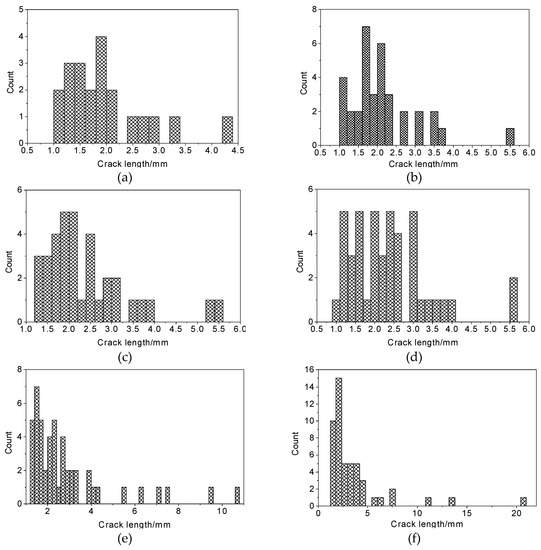 Distribution of crack length for various freeze-thaw cycle numbers. (a) Freeze-thaw = 0; (b) Freeze-thaw = 1; (c) Freeze-thaw = 3; (d) Freeze-thaw = 6; (e) Freeze-thaw = 10; (f) Freeze-thaw = 15.