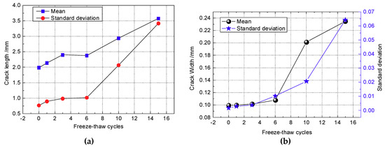 As seen in Figure 17, both the mean and standard deviation of the crack length and width increase with the number of freeze-thaw cycles. The rate of increase of crack length and width in the first six freeze-thaw cycles is relatively low; then, the mean and standard deviation of crack length and width increase rapidly after more than six freeze-thaw cycles.