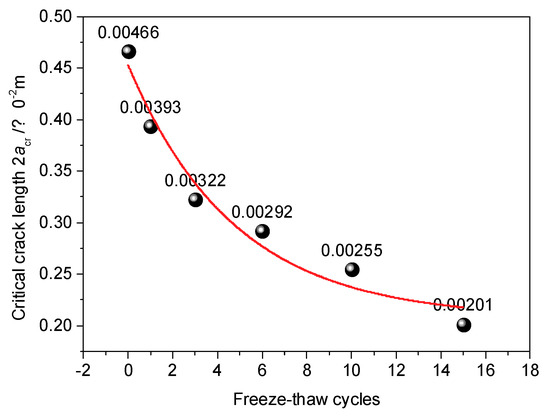 The critical length ( in Figure 12) of a crack with increasing freeze-thaw cycle number follows the trend of a negative exponential change, thus the fitting equation is constructed as follows: