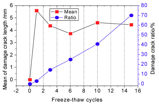 As seen in Figure 19, the mean of crack length first increases, then decreases and then once more increases with the increase of freeze-thaw cycle number. In contrast, the proportion of damage cracks present in the sample increases continuously with an increasing number of freeze-thaw cycles. After the first freeze-thaw cycle, the average length of a damage crack develops rapidly, mainly due to the expansion of unstable cracks. After more than three freeze-thaw cycles, the mean damage crack length begins to decrease, and the proportion of damage cracks begin to increase, indicating that the original stable cracks have now become critical cracks and unstable cracks. After more than six freeze-thaw cycles, both the critical crack length and the proportion of damage cracks follow increasing trends.