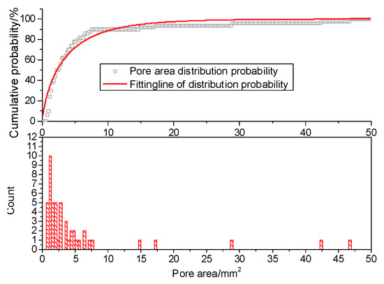 The cross-sectional area of a cylindrical specimen is π × (19.55 mm)2 = 1200.12 mm2. The distribution laws of the cumulative probability and pore count are shown in Figure 21.