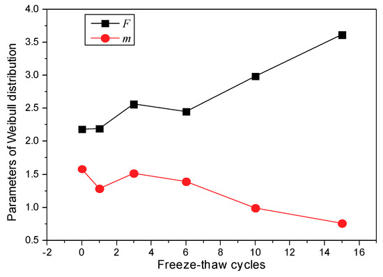 The trends followed by parameters m and F of the Weibull distribution function in Equation (7) after freeze-thaw cycling are shown in Figure 22.