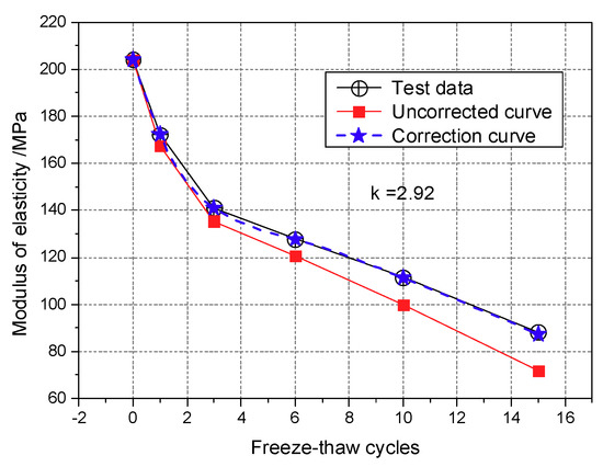 where is the modification parameter determined based on the test data and is related to the freezing temperature. The freezing temperature of −10 °C was adopted in this study; hence, the modification parameter under the confining pressure of 100 kPa is 2.92. According to the revised calculation results presented in Figure 13, this factor is very close to the experimental results. Equation (14) establishes the mathematical relationship between the elastic modulus and pore area. Considering the effect that freeze-thaw cycling has on improving the mechanical properties of CIAS, the proposed freeze-thaw damage model expressed in Equation (14) is reasonable.
