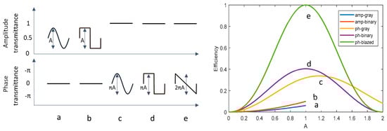 In order to give an estimation of the hologram efficiency, we make use of a model reported by Brown in 1969 [32], which considers monodimensional gratings with a periodical structure that is either binary or grayscaled. The wavelength of the incident light is assumed to be much smaller than the grating period, so the scalar diffraction approximation can be applied. Figure 1 reports the theoretical efficiency of gray-scaled (a) and binary (b) amplitude holograms, and gray-scaled (c), binary (d) and blazed (e) phase holograms. The efficiency is related to the amplitude of the modulation A, which varies between 0 and 1 in the case of amplitude holograms and between 0 and 2π in the case of phase holograms.