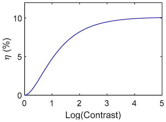 The contrast is asymptotic to the maximum efficiency of 10.1% for values larger than 5000, but values around 8% are good enough for many applications and in particular for interferometric purposes. These efficiencies are reached when the contrast is larger than 100, value that is obtained for optical density of the film in the colored form larger than two (considering again an absorbance zero for the uncolored form).