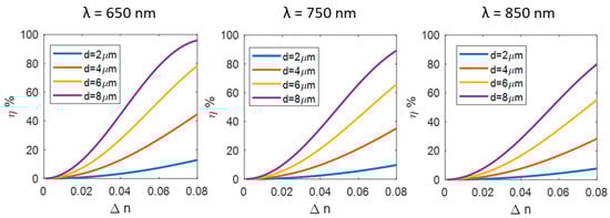 where λ is the wavelength of the incident light. We studied the efficiency dependence by Δn, considering and 19°. In Figure 3, we report the results for a Δn in the range 0–0.08.