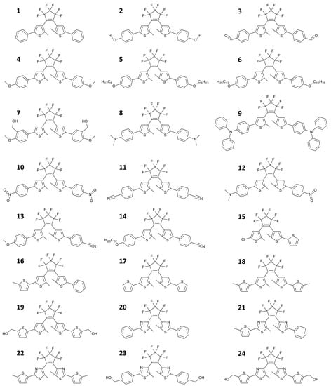Series of 1,2-diarylethenes in their open state (uncolored). They differ for the aromatic ring in the switching structure (thienyl from 1 to 19 or thiazolyl from 20 to 24) and for the lateral groups. Electroactive substituents can be also present to give push-push structures (compounds from 4 to 9), pull-pull structure (compounds 3, 10 and 11) or push-pull structures (compounds from 12 to 14) in their closed (colored) state.